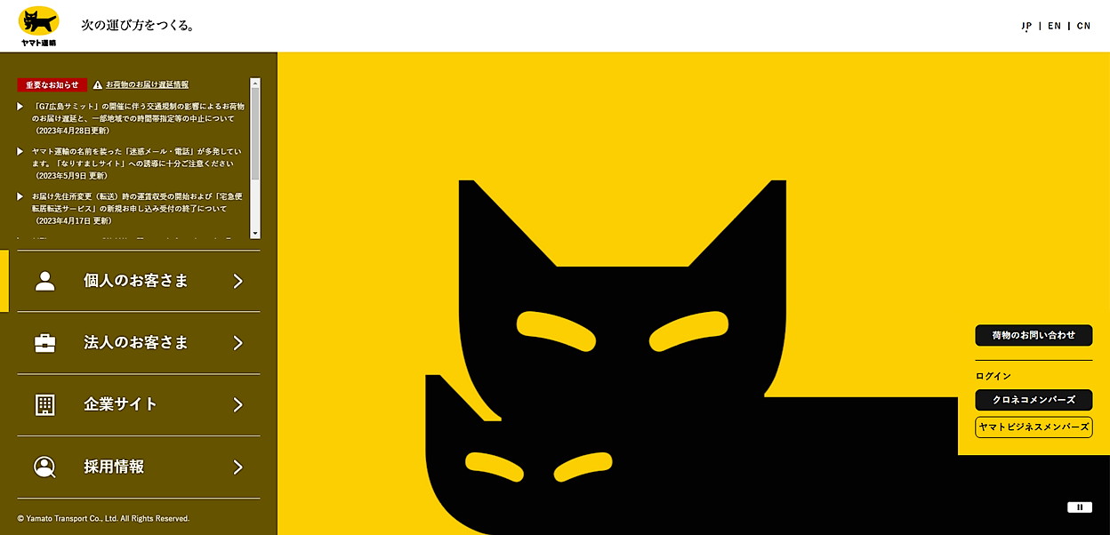 サイトリンク:http://www.kuronekoyamato.co.jp/ クロネコヤマトの宅急便でお馴染みのヤマト運輸のホームページです。 ファーストビューは固定されており、左のカラムから個人や法人などへ画面遷移し…
